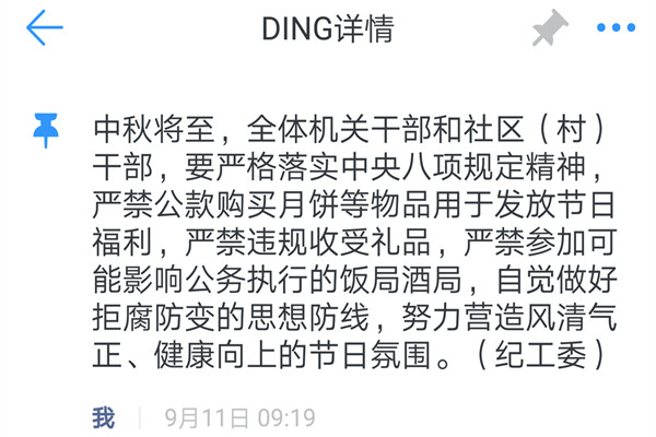 “中秋将至,纪检监察组织将加大对顶风违纪的检查力度,作为机关干部,要严格落实中央八项规定精神,严禁公款购买月饼等物品用于发放节日福利,严禁违规收受礼品,严禁参加可能影响公务执行的饭局酒局,自觉做好拒腐防变的思想防线,努力营造风清气正、健康向上的节日氛围。”这是在东港街道创城“省测”迎检暨庆祝新中国成立70周年维稳安保动员部署大会上,东港街道办事处主任丁勇对全体机关干部提出的节日期间的要求,提醒广大机关干部要廉洁自律,坚决杜绝“节日腐败”,时刻紧绷纪律红线,严防“四风”滋生。